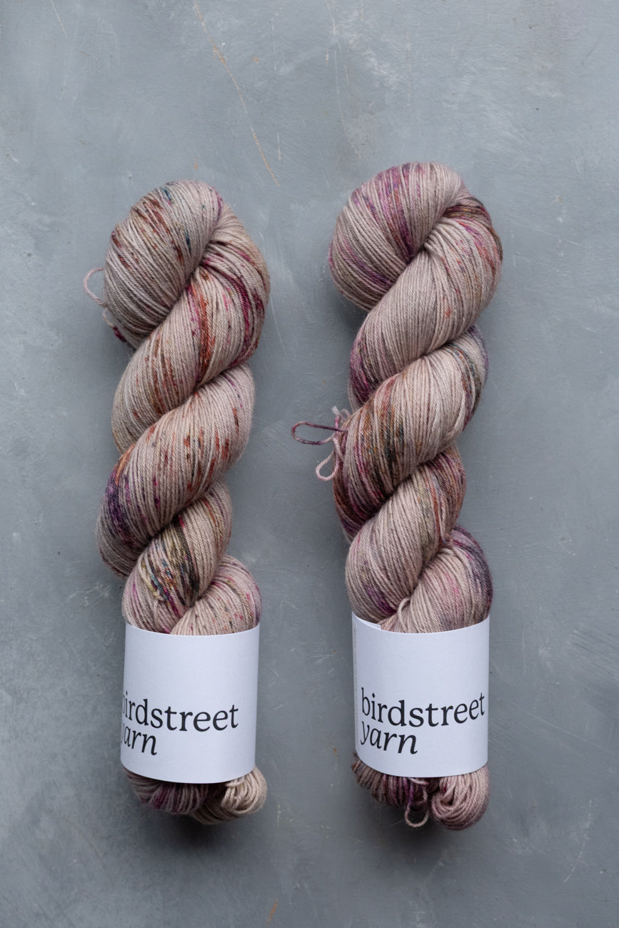 "Mists And Mellow Fruitfulness" is a beautiful, speckled, Autumnal yarn, on a pale beige-grey base. It is speckled with pinks, berry, burgundy, golden browns and pops of green, reminiscent of misty Autumnal mornings.