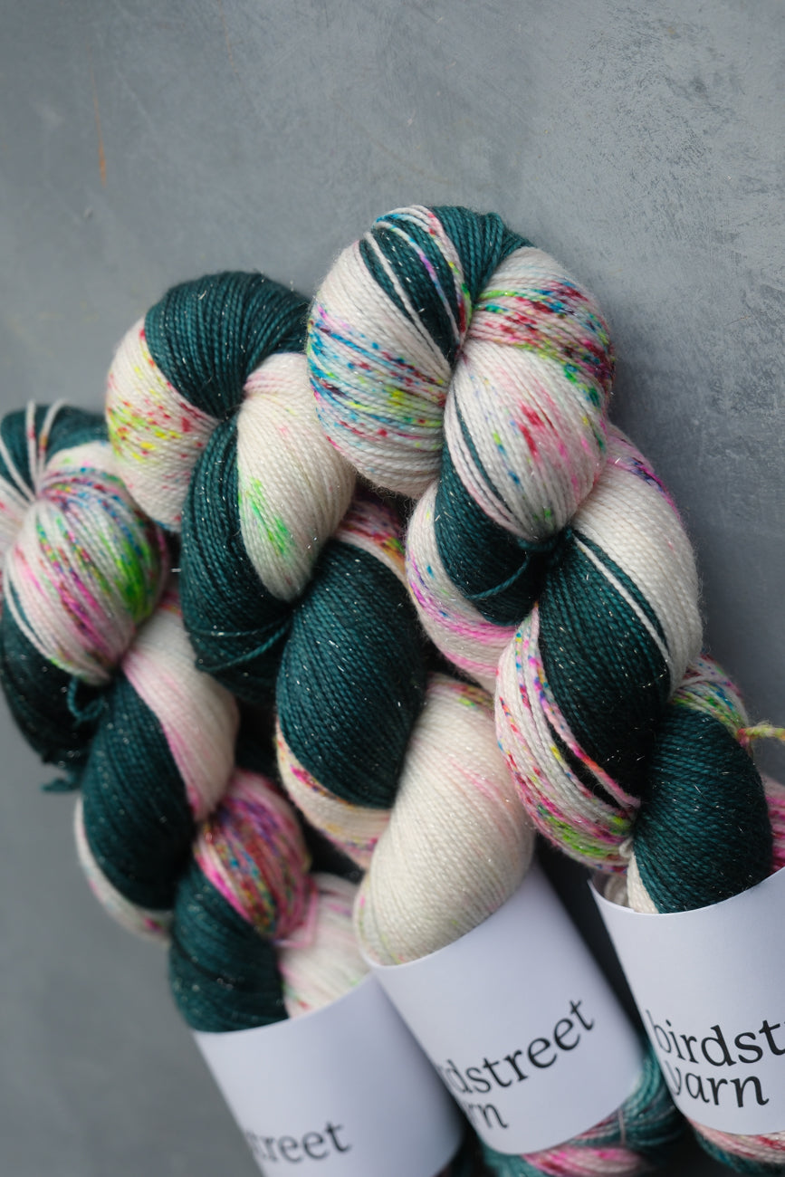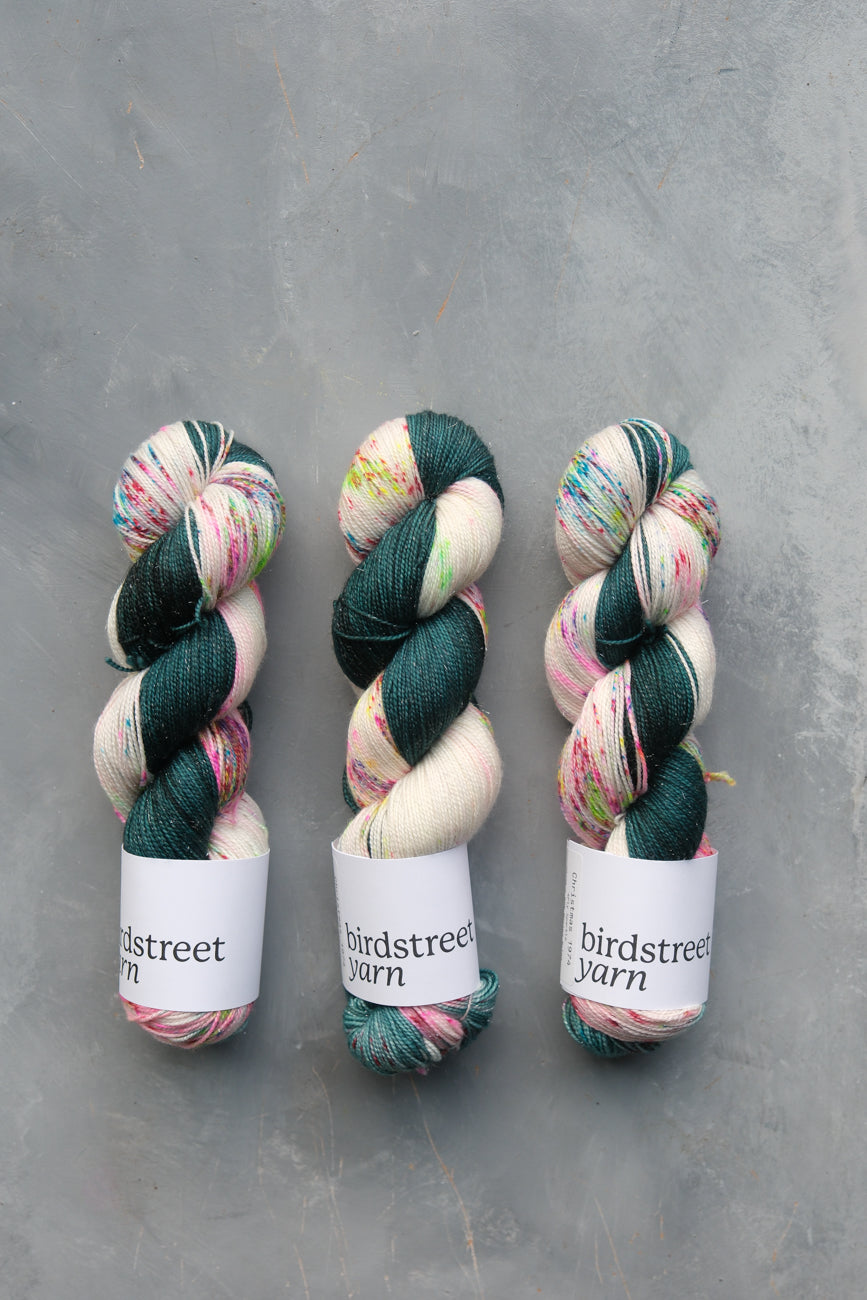 "Christmas 1974" is a beautiful, Christmas colourway, with a variegated base of deep green, speckled with festive pops of reds, greens, pink, purple and turquoise, reminiscent of colourful Christmas lights from the 1970's.