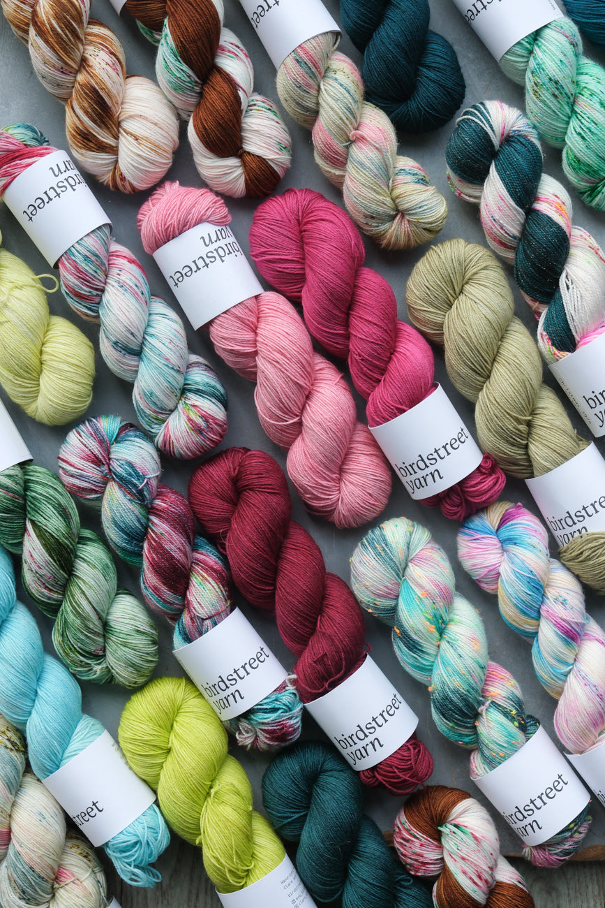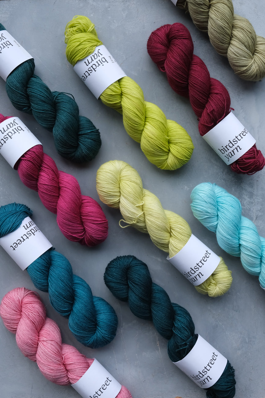 Hand-dyed using professional acid dyes; no two skeins are completely identical due to the nature of this process, though they are dyed in batches.