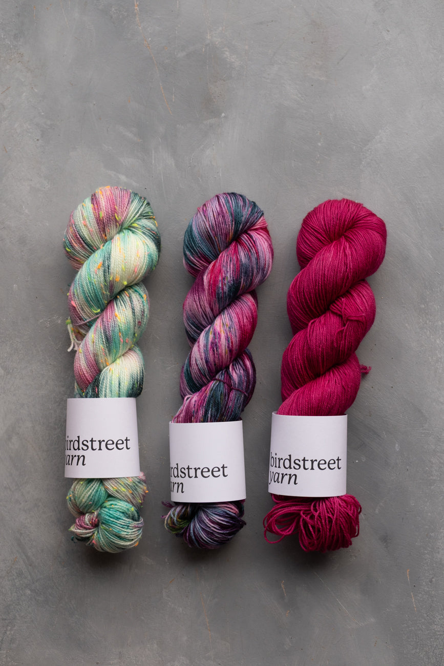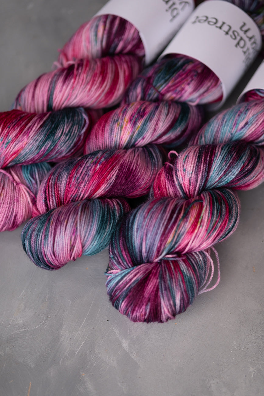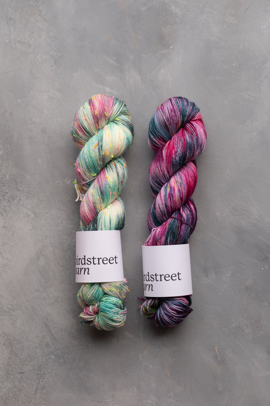 Hand-dyed using professional acid dyes; no two skeins are completely identical due to the nature of this process, though they are dyed in batches.