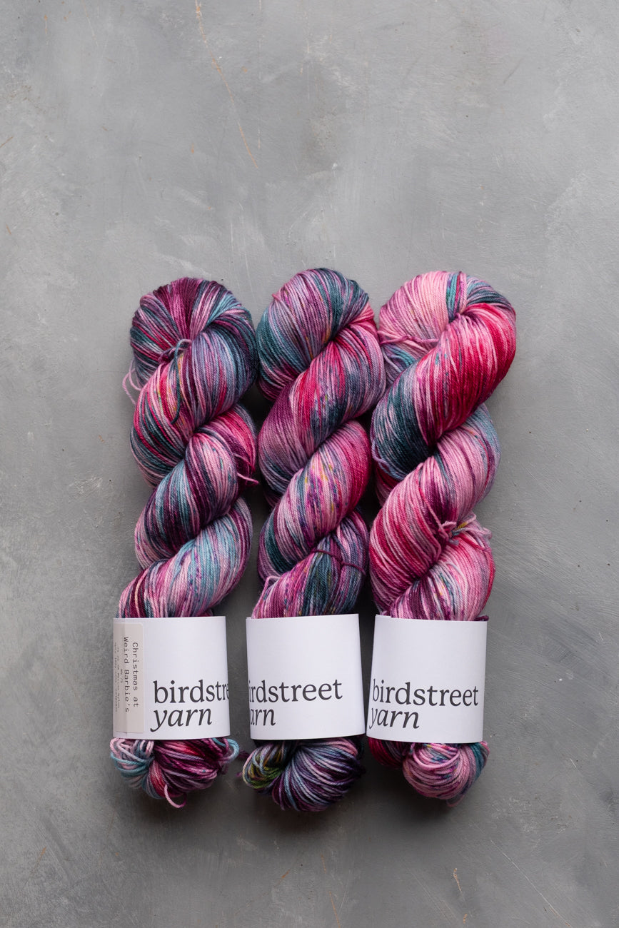"Christmas At Weird Barbie's" is a fun, festive colourway, with a gorgeous pink, aqua and teal, variegated base, speckled with pops of a range of greens and pinks.