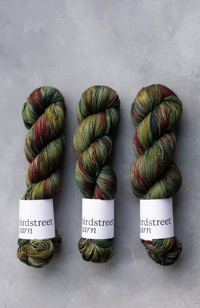 "How Lovely Are Your Branches" is a NEW, beautifully-variegated colourway of greens, reds, gold and teal speckled with the same colours.