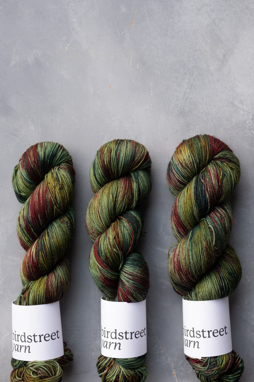 Hand-dyed using professional acid dyes; no two skeins are completely identical due to the nature of this process, though they are dyed in batches.