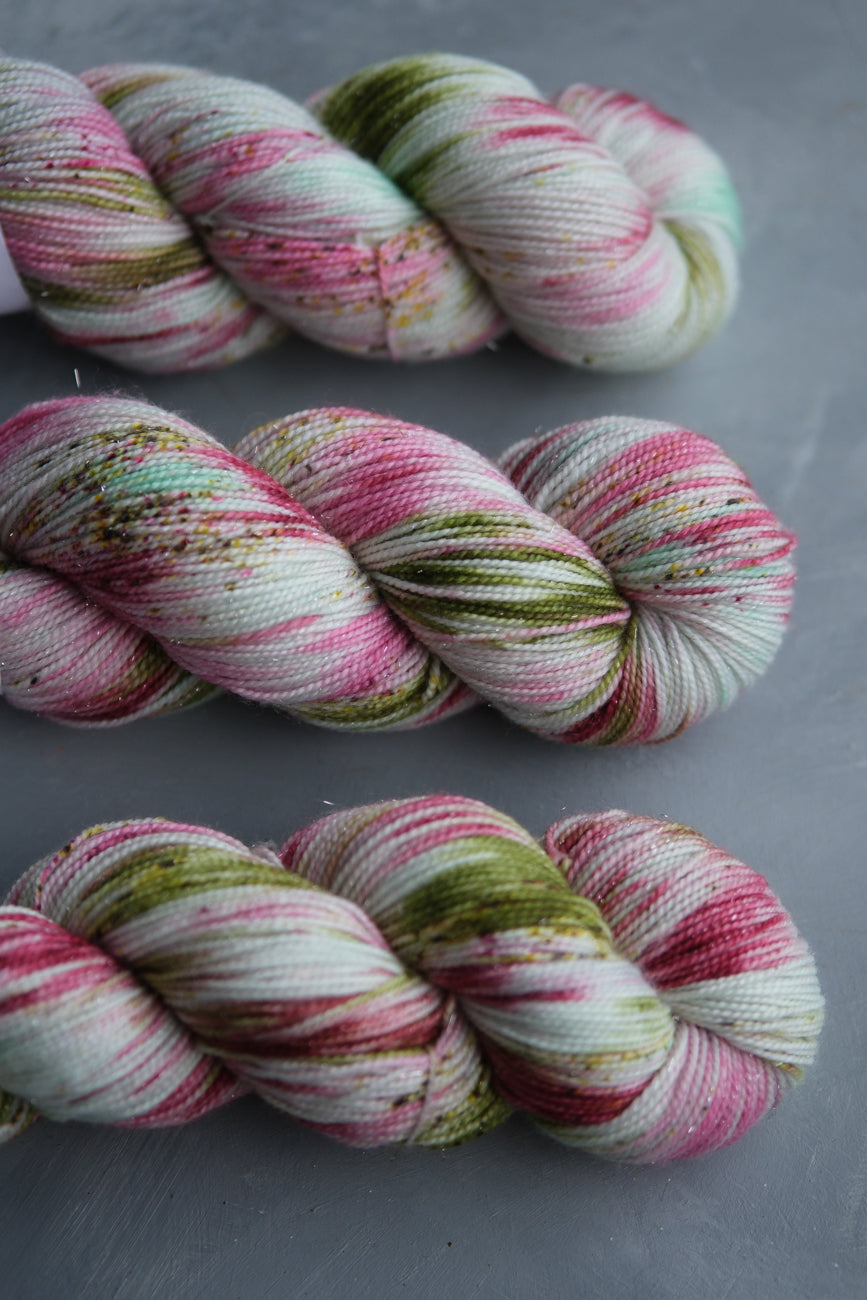 "Merry Little Christmas" is a beautiful, festive colourway with a very light green base, variegated with soft pink, red, moss-green and spearmint, speckled with greens and pinks.