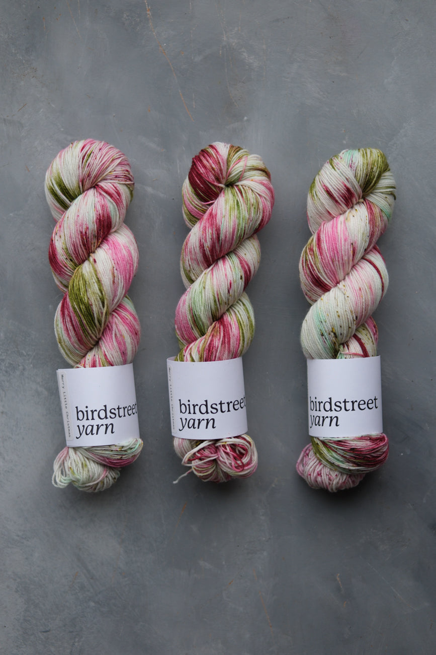 It is also shown with the NEW Merry Little Christmas Minis, re-imagined from this colourway, into 5x20g tonals.