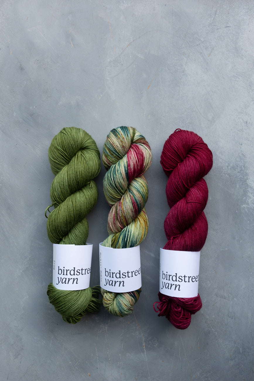 "Rockin' Robin" is a popular, beautifully-variegated colourway of greens, reds, mustard and teal speckled with the same colours; voted to bring back by so many of you!