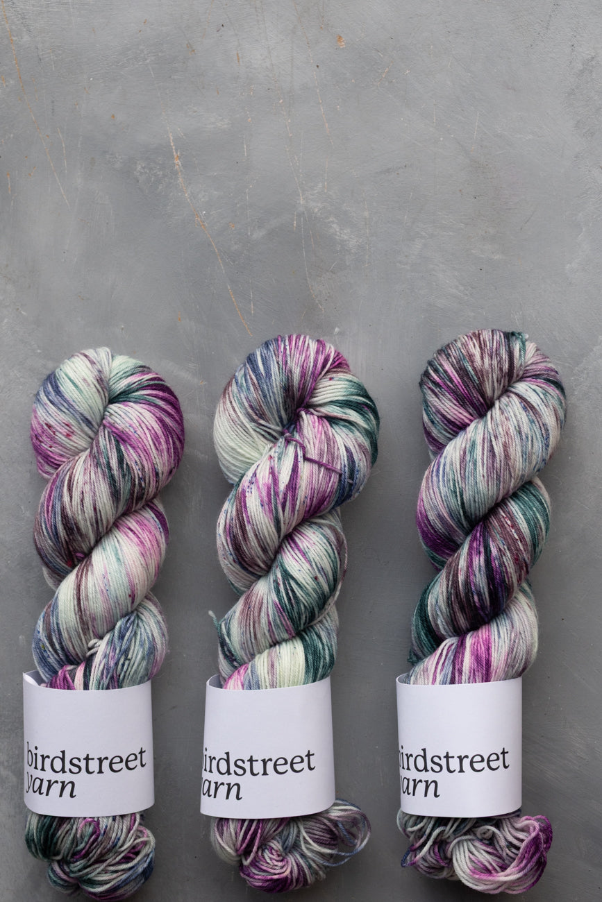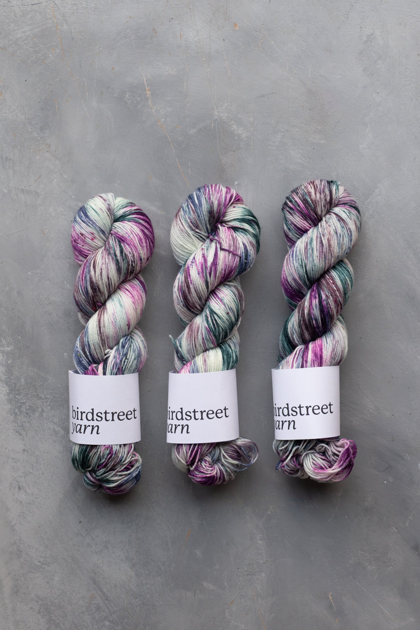 Hand-dyed using professional acid dyes; no two skeins are completely identical due to the nature of this process, though they are dyed in batches.
