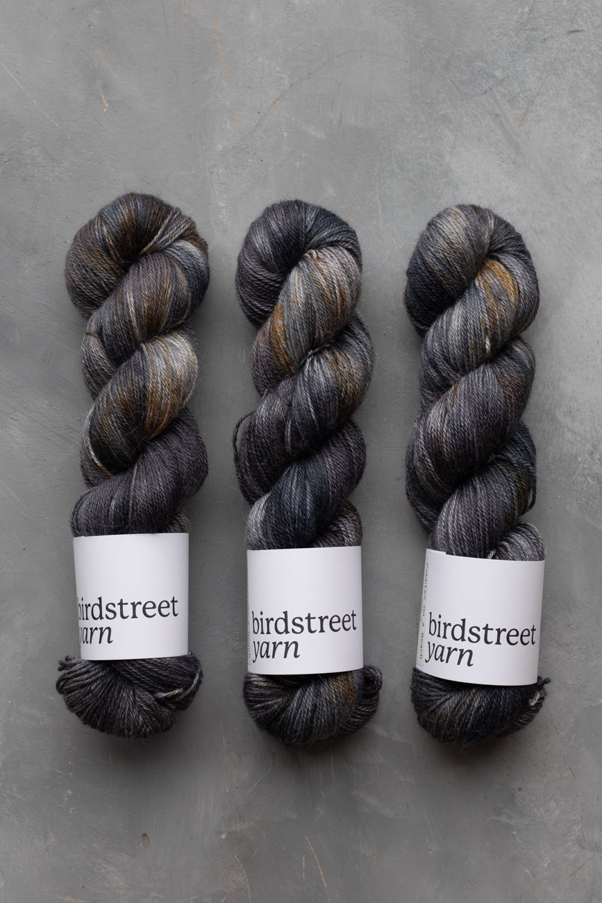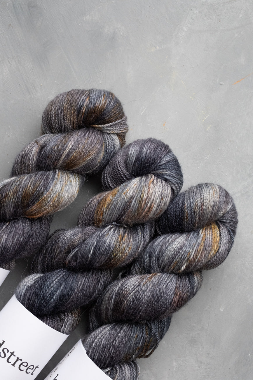 "Pebbles On A Beach ASC" is a beautiful yarn, on the incredibly soft, luxurious base of Alpaca / Silk / Cashmere, creating wonderful drape. It has a variegated base of blue-grey and black, speckled with browns and greys, on our 4ply base.