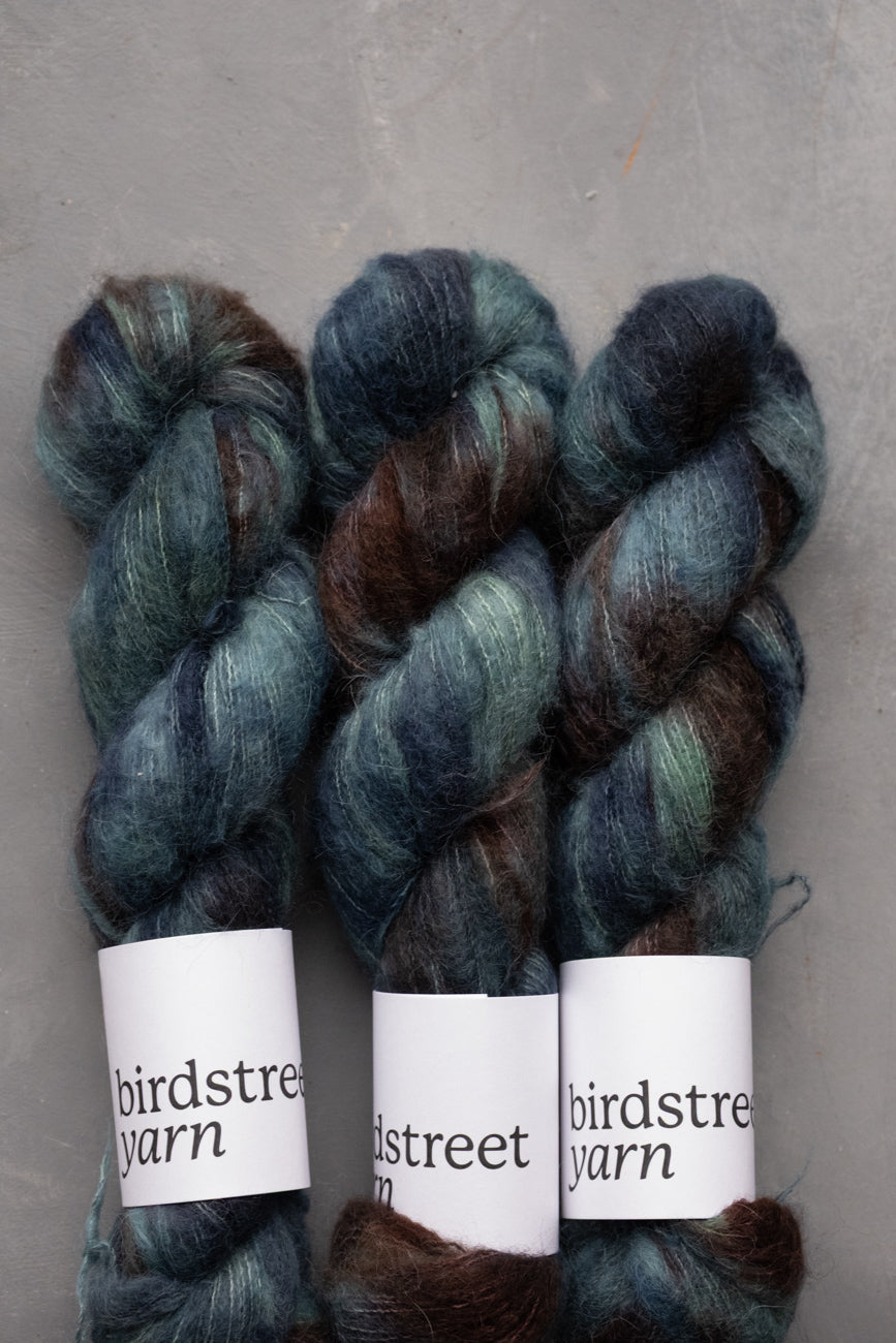 "Wild Wood Cloud" is a beautifully-variegated colourway of teal, blues, greens and browns, perfect for using on its own or pairing with 4ply variegated colourways, like Wild Wood (available on ASC).