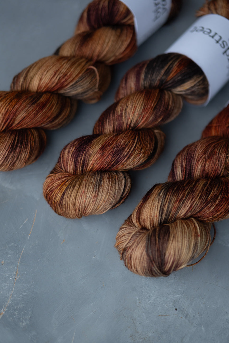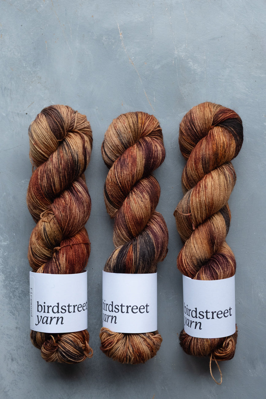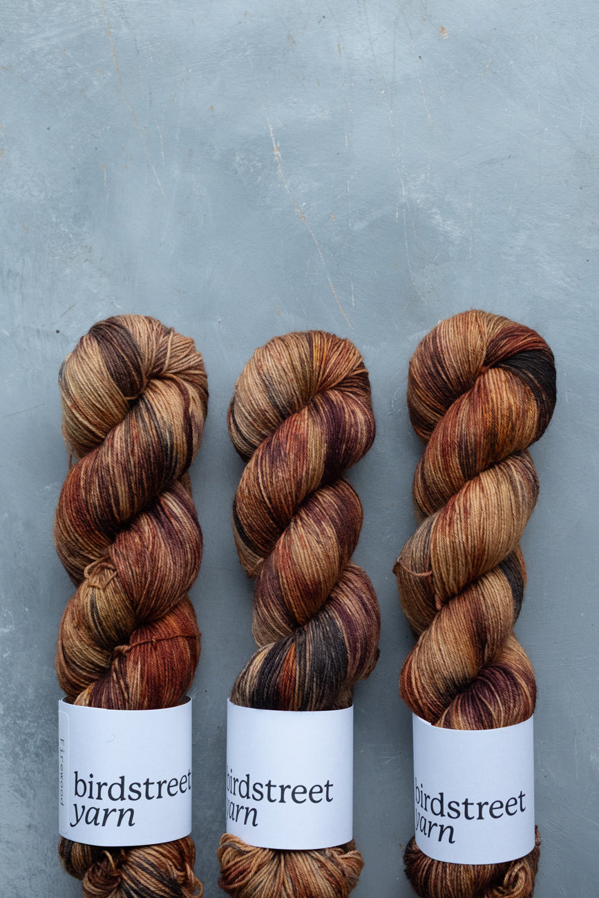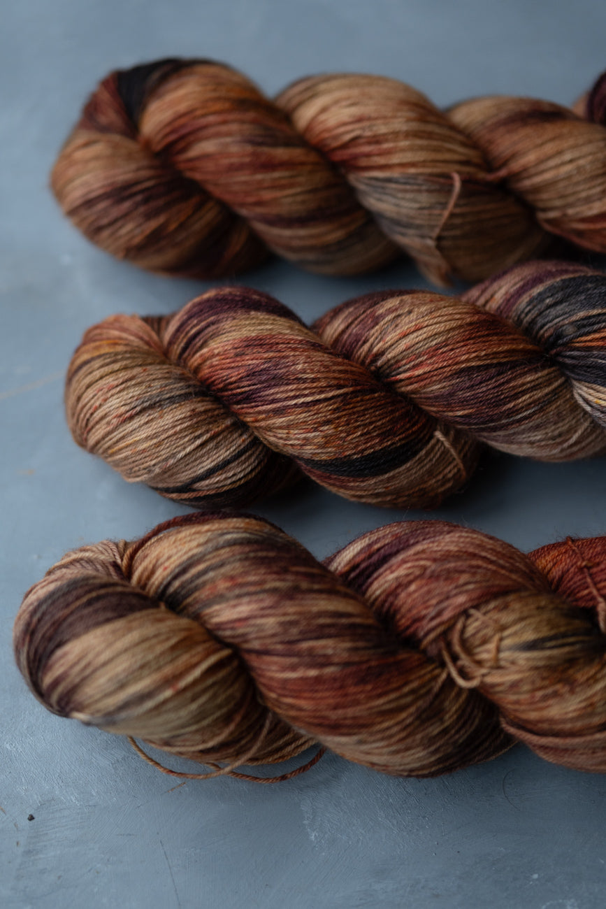 "Firewood" is a beautifully-variegated colourway of browns, and black, speckled with chestnut, rust and other browns.
