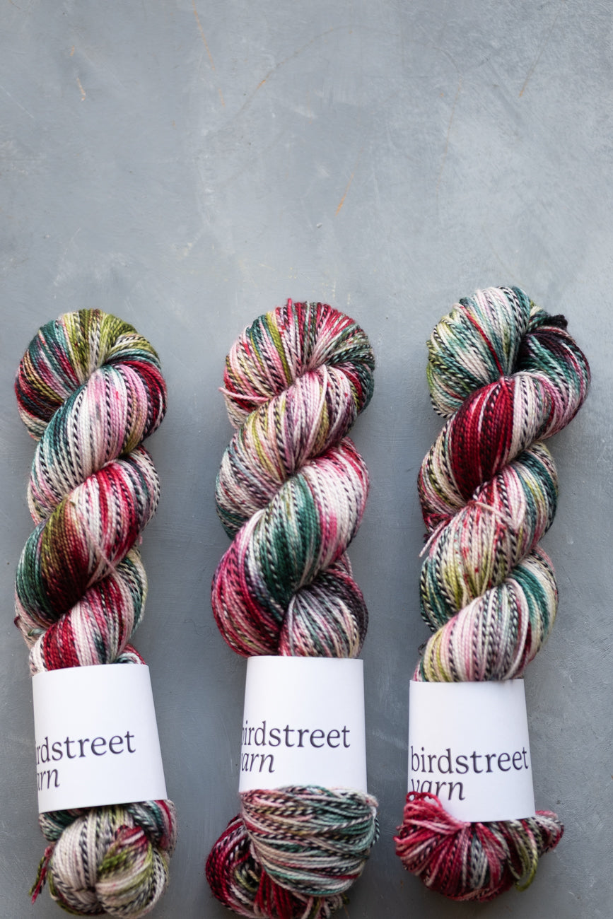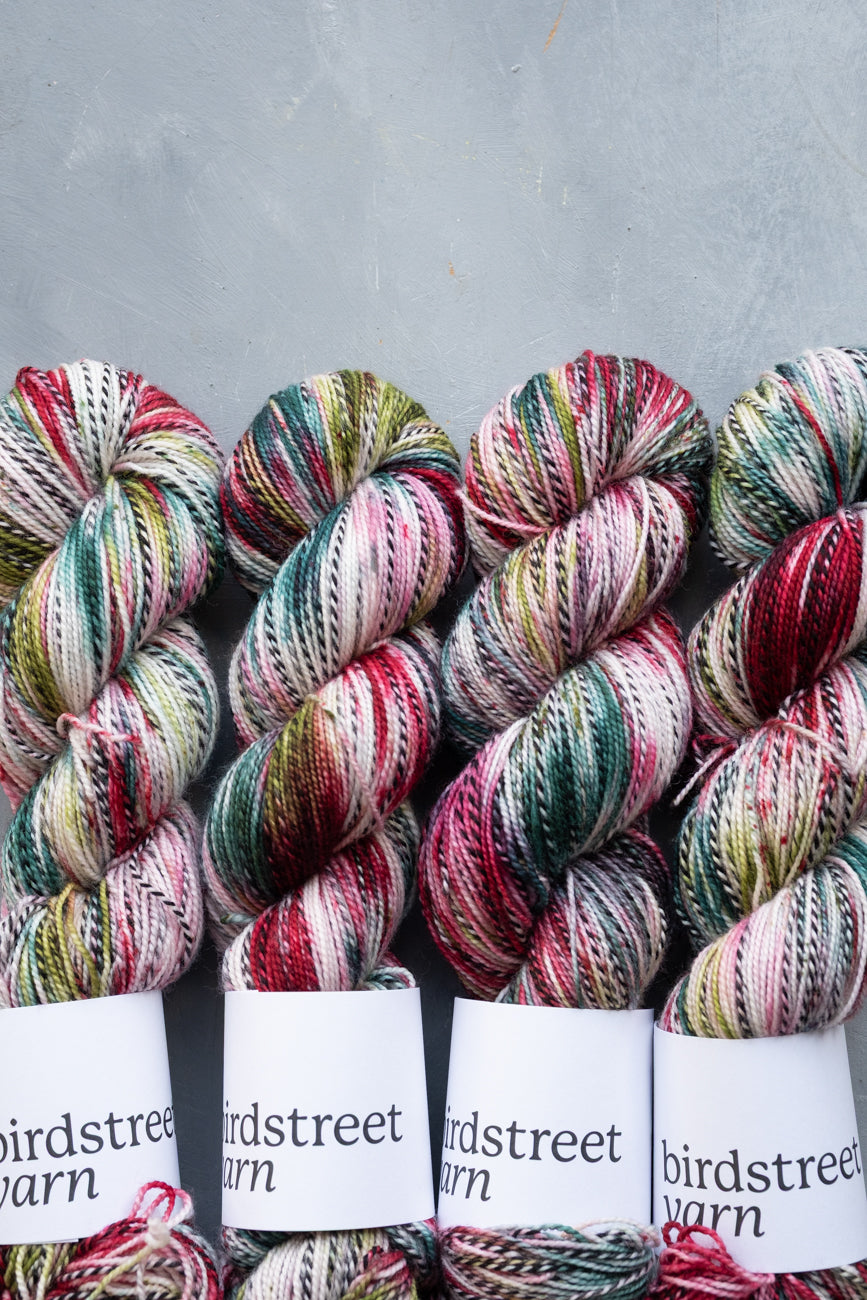 Hand-dyed using professional acid dyes; no two skeins are completely identical due to the nature of this process, though they are dyed in batches.