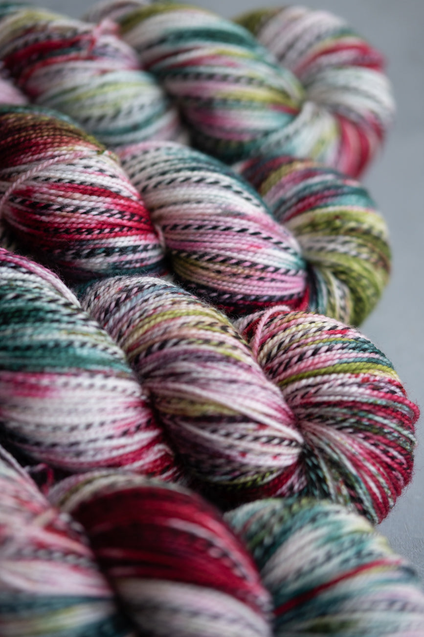 "Another Bloomin' Christmas (Zebra)" is a beautiful NEW variegated, Christmas colourway, with a multi-coloured base of white, greens, pink and red, speckled with pops of greens and reds.