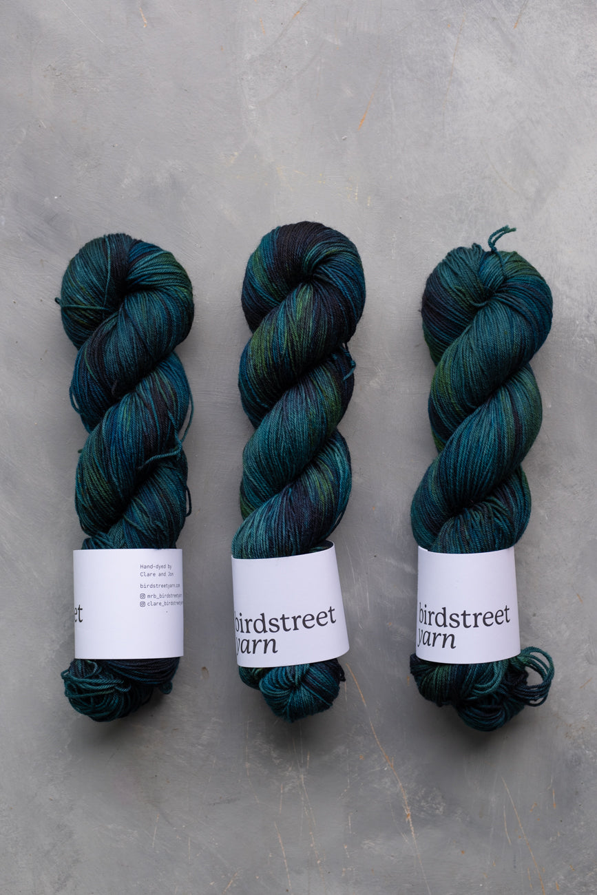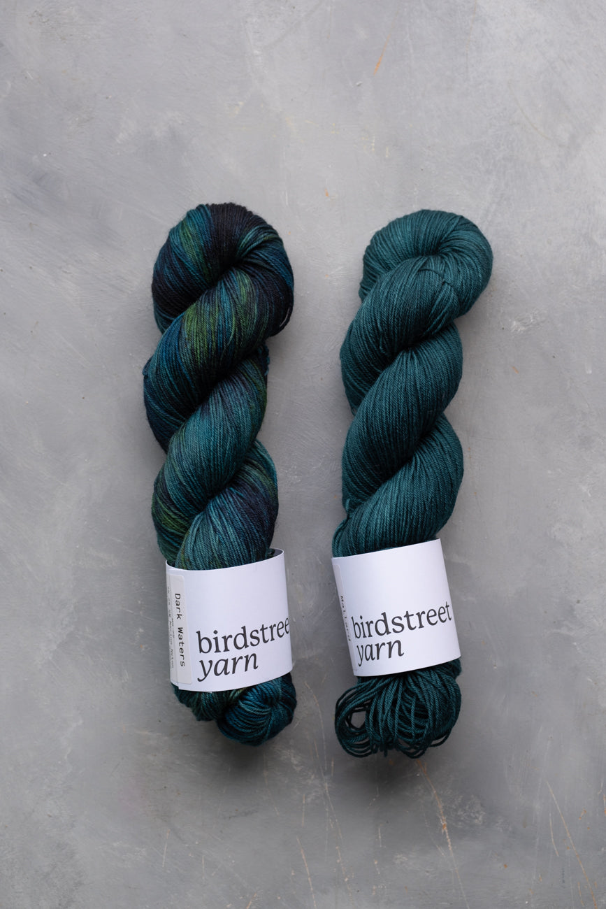 "Dark Waters" is a beautiful, NEW dark, jewel-toned, variegated colourway, with a base of deep teals, blues and vibrant greens, speckled with greens, blues and pops of brown.