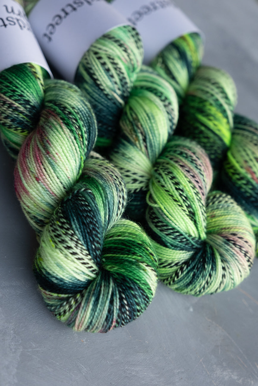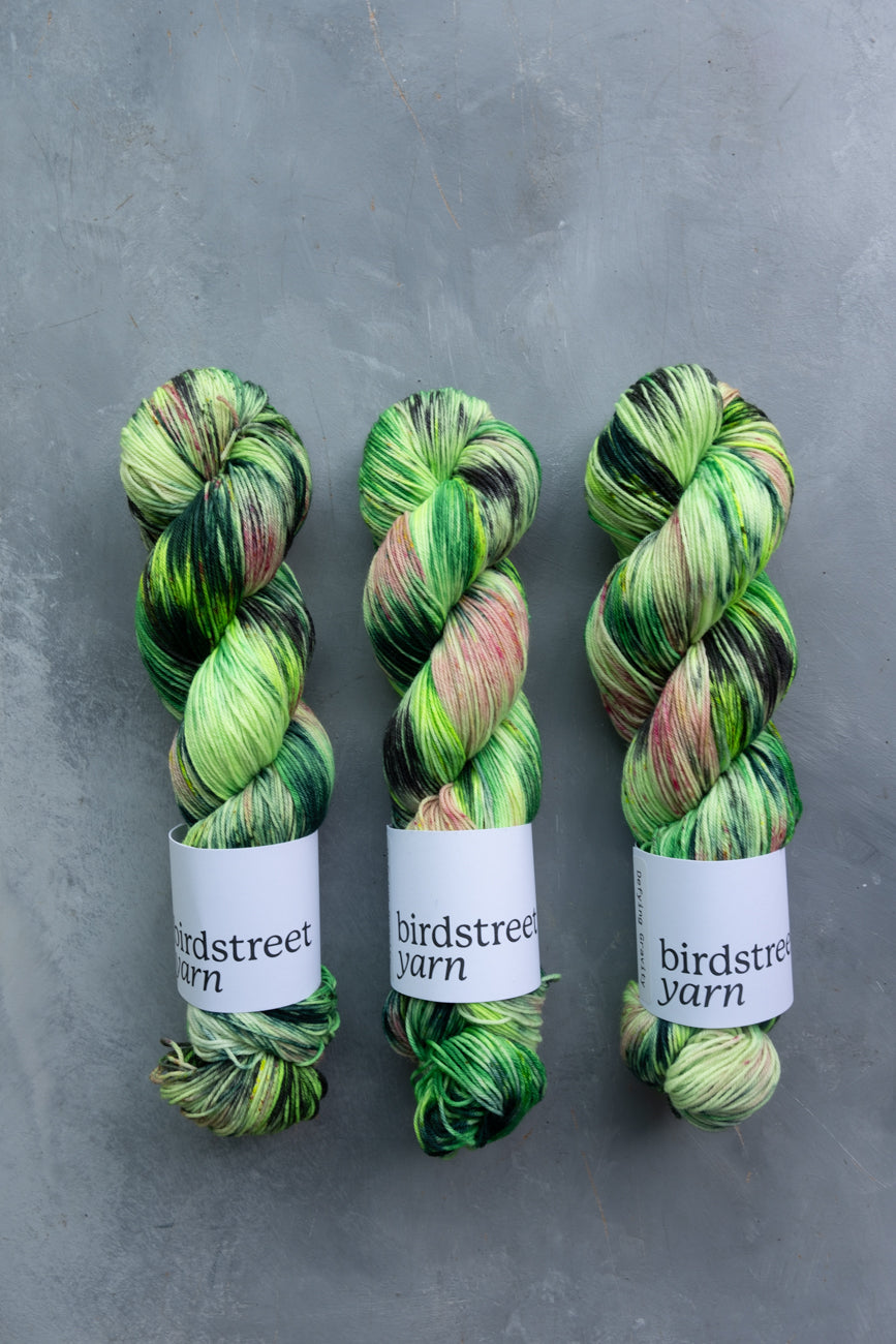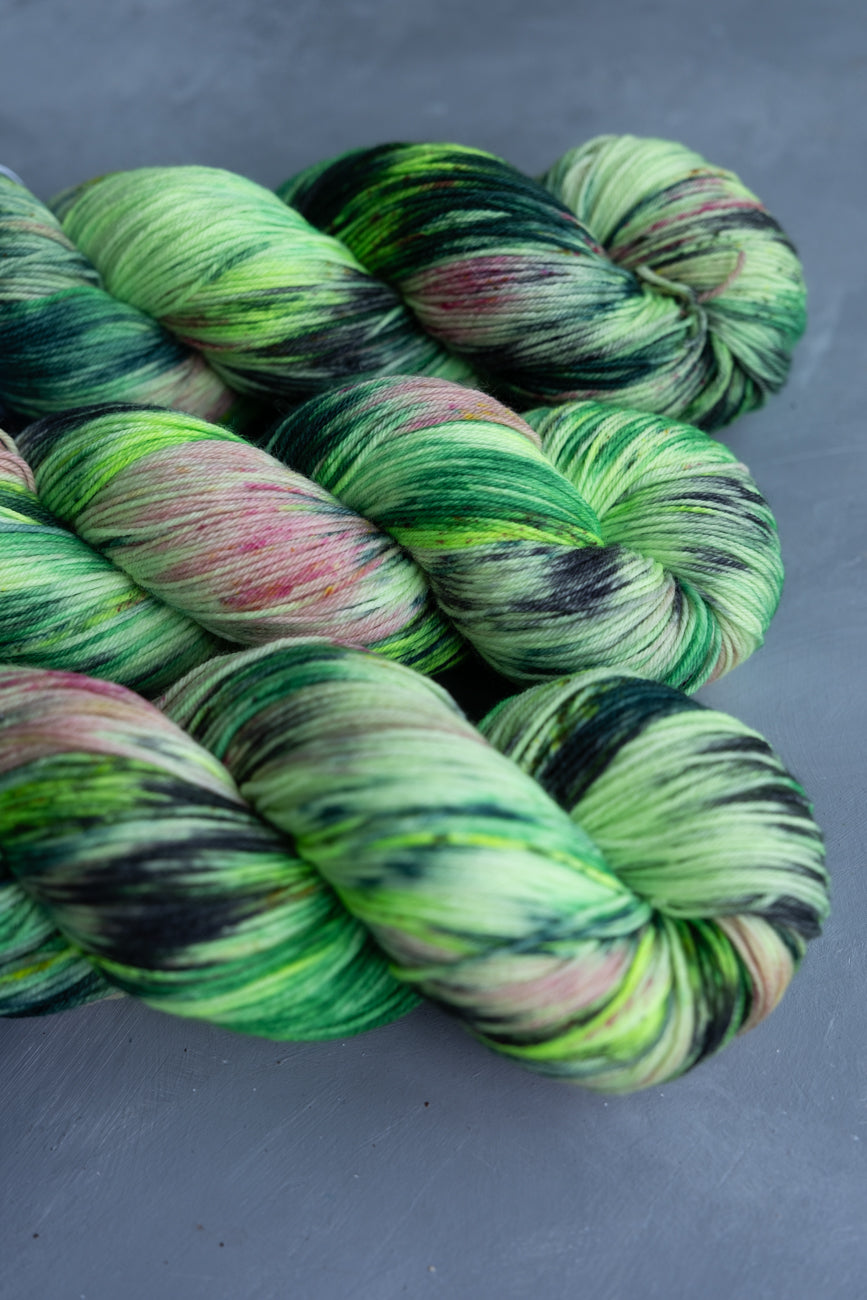 "Defying Gravity" is a stunning NEW colourway, with a vibrant variegated 4ply base, of bright greens, deep green, pinks and black, speckled with pinks and green.