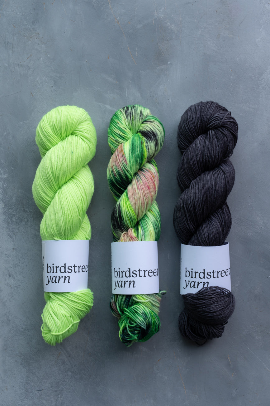 This wonderful colourway is shown with NEW Wicked (vibrant-green tonal), Piglet and Stonewash.